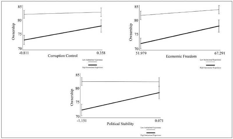 Similarly, Model 6 scrutinizes Hypothesis 5, which contends that institutional experience in like contexts negatively moderates the correlation between economic freedom and the degree of ownership. The outcome here aligns with the findings from Hypothesis 4, substantiating a significant relationship but with a moderating effect that diverges from the projected expectations in Hypothesis 5.
