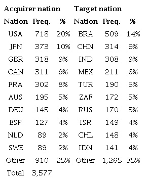 The most frequently occurring host country in the sample is Brazil, constituting 14% of the acquisitions, which notably distances it from China and India, each accounting for 9%. On the acquirer side, the United States emerges as the most dominant, representing 20% of the sample. In contrast, Japan, the second most frequent acquirer nation, comprises approximately half of the United States’ representation with 10%, closely followed by Great Britain and Canada, each constituting 9% of the sample.