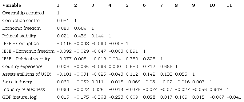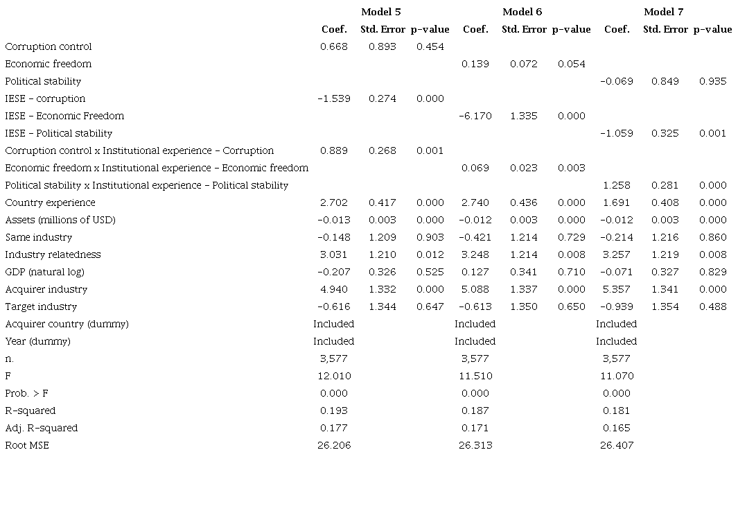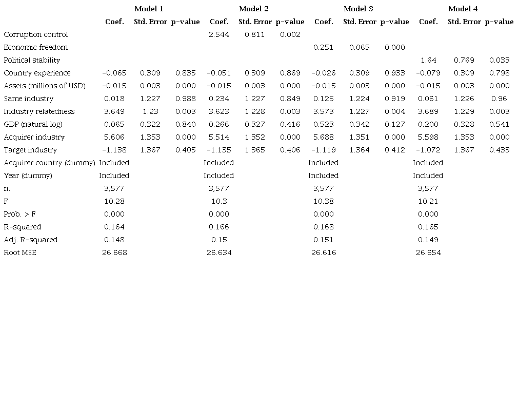 We depict the correlations between our variables in Table 3. It is possible to analyze the correlations present in the variables of interest in the study. There is a moderate correlation between economic freedom and corruption control, although not alarmingly high. The correlation between political stability and corruption control is weak. The correlation between political stability and economic freedom is negligible. The experiences, among themselves, correlate greatly as they are a product of the number of acquisitions performed by the acquiring firm. For this reason, they were not used in a single model since the purpose of this research is that a concept can be used in three different forms of experience, always focusing on a similar context. It is also noteworthy that the correlation between the moderating variables of the study is relatively high, identifying that they operate similarly, both from an empirical point of view and a conceptual point of view.