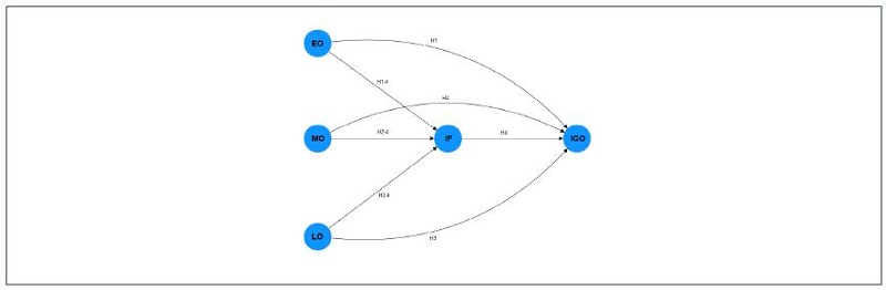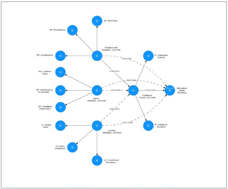 By exploring the relationship between institutional factors in the model, we determined that they are positively influenced by EO and LO while being negatively influenced by MO. Furthermore, institutional factors serve as a mediator in the relationship between EO and IGO. These results highlight the significant role that institutional factors play in examining strategic orientations and their impact on the propensity for the internationalization of entrepreneurial businesses in an emerging economy.