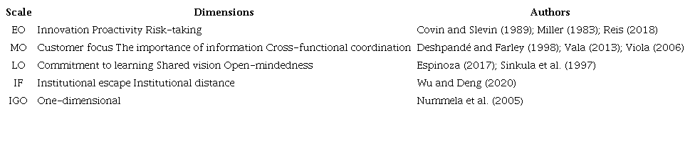 It is important to note that the scales for propensity to internationalize (IGO) and IF were not previously validated in the Brazilian context. Therefore, a process of translation, adaptation, and validation was conducted, including stages such as translation into the new language, synthesis of translated versions, evaluation by experts, evaluation by the target audience, back-translation, and a pilot study (Borsa et al., 2012). Table 1 provides an overview of the scales used in the study, the dimensions analyzed for each component construct, and the main authors associated with developing the research model.