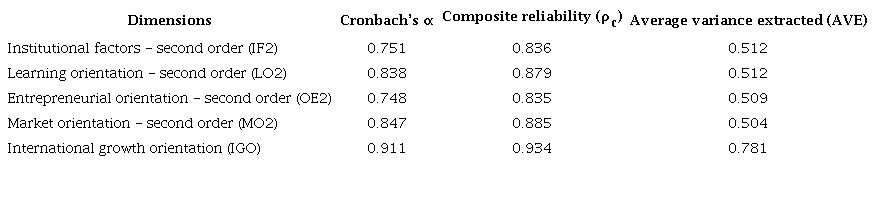 Initially, we decided to exclude certain indicators with factor loadings (λ) below 0.6 because the AVE was less than 0.5. These indicators include EO (innovation) (EOI_01; λ = 0.508), LO (commitment to learning) (LOLC_04; λ = 0.310), open-mindedness (LOOM_03; λ = 0.410), and IGO (IGO_05; λ = -0.217; IGO_06; λ = -0.445). This treatment of the variables resulted in improved values of Cronbach’s alpha (α) and composite reliability (ρc), ranging from 0.7 to 0.95, as well as enhanced convergent validity of the model, as measured by the AVE (>0.5) (Table 2).