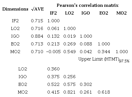 The Fornell-Larcker and HTMT (heterotrait-monotrait ratio) criteria were employed to assess the discriminant validity of the model. Discriminant validity is defined as an indicator demonstrating the extent to which a dimension is truly distinct from other dimensions based on empirical standards (Hair et al., 2017). There are two methods for analyzing discriminant validity: (1) the Fornell-Larcker criterion, which compares the square root values of the AVE with the correlations between LVs, with the requirement that the square roots of the AVEs exceed the correlations between variables (Fornell & Larcker, 1981); and (2) the heterotrait-homotrait ratio (HTMT) criterion proposed by Henseler et al. (2015), which estimates the true correlations between dimensions in the model (Hair et al., 2017). It was found that both criteria were met, as the smallest square root of the AVE (0.710) exceeded the largest correlation (MO2 x LO2 - r = 0.549). Additionally, the upper limits of the estimated HTMT values were below 1.0 (Hair et al., 2017).