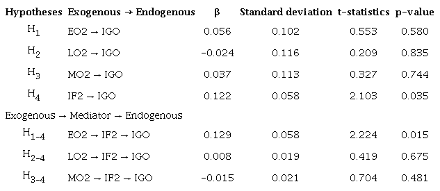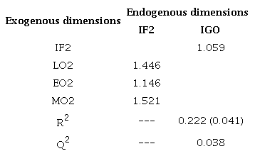 The (multi)collinearity analysis is determined using the VIF, which measures how much the standard error has increased due to collinearity among dimensions (Hair et al., 2017). VIF values less than five indicate the absence of collinearity issues. Table 4 presents the VIF, R2, and Q2 values for the dimensions of the model. All VIF values relating the endogenous dimension to the other exogenous dimensions were below five, indicating that (multi)collinearity does not reach critical levels in terms of the relationships and does not pose a problem during model estimation. The R2 values were moderate for IGO (R2 < 0.225) and significant (Cohen, 1988; Lopes et al., 2020). Regarding the Q2 value, based on the results of the blindfolding procedure, the model demonstrated significant predictive relevance for the dimensions, with a weak magnitude (Q2 < 0.075) for IGO.