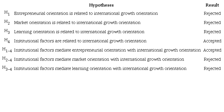 Based on the presented results, one can conclude that two of the initially proposed hypotheses were supported. Specifically, institutional factors were found to be related to international growth orientation and mediate the relationship between entrepreneurial orientation and international growth orientation. Nonetheless, the other hypotheses, which proposed a direct positive influence of strategic orientations (entrepreneurial, market-oriented, and learning-oriented) on the international growth orientation of the investigated TBCs, were not supported.