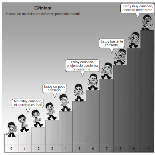 En virtud de lo anterior, se han desarrollado instrumentos adaptados a los niños, los cuales han demostrado un rendimiento aceptable en cuanto a sus propiedades psicométricas (9,10,11,12,13,14,15). Son escasas las escalas adecuadas en idioma español. En Chile, se han elaborado algunas para cuantificar el esfuerzo percibido en niños (16,17), las cuales son adaptaciones arbitrarias de la escala de Borg, pero hasta ahora no se han hecho estudios para determinar sus propiedades psicométricas y hay discrepancias sobre la utilidad clínica de los resultados (18), por lo que se desarrolló un nuevo instrumento para evaluar la percepción del esfuerzo en población infantil, denominado escala de medición de esfuerzo percibido infantil (EPInfant). Este instrumento se diseñó mediante una metodología orientada a disminuir potenciales fuentes de error sistemático, y sus descriptores verbales e ilustraciones visuales se adaptaron para niños con diversos niveles de desarrollo cognitivo. Sin embargo, su rendimiento no se había valorado durante una prueba de ejercicio de intensidad gradualmente creciente.
