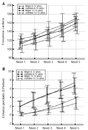 En este estudio ningún grupo superó los 8 puntos de esfuerzo percibido. Se debe considerar que durante la etapa de inducción se enfatizó en que la escala EPInfant pretende medir el esfuerzo percibido general y no local (por ejemplo, fatiga de piernas); por este motivo, es de esperarse que una prueba de escalón, cuyo estímulo fatigante va dirigido principalmente a la musculatura de las piernas, produzca una percepción de esfuerzo general inferior a la percepción de esfuerzo en las extremidades inferiores. En 40 niños de ambos sexos entre los 10 y los 11 años de edad, Robertson, et al., constataron que el esfuerzo percibido general fue inferior a la percepción de fatiga en las piernas durante una prueba de escalón de intensidad creciente (24). En su estudio, el nivel general de esfuerzo percibido y el de fatiga en las piernas al final de la prueba, fueron cercanos a 8 y 9, respectivamente, lo que es similar a lo observado en este estudio en el grupo de 8 a 12 años