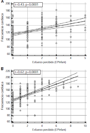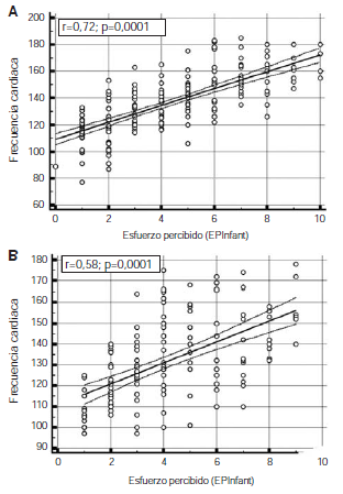 Por su parte, Yeilling, et al., observaron una correlación débil en niños entre los 11 y 12 años de edad, y entre moderada y fuerte en niñas de 14 y 15 años (25). En este estudio, pese a que los niveles de correlación observados fueron distintos en cada grupo de edad y sexo (entre 0,43 y 0,73), fue posible generar un modelo de regresión muy significativo (p<0,0001) para la estimación del estrés fisiológico (frecuencia cardiaca) a partir del esfuerzo percibido en los cuatro grupos estudiados, lo que sugiere la existencia de un importante grado de dependencia entre la percepción del esfuerzo, medido mediante la escala EPInfant, y el estrés fisiológico durante el ejercicio de intensidad creciente.