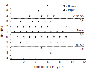 En cuanto a la confiabilidad entre observadores, el coeficiente de correlación intraclase global calculado fue de 0,88 (0,82-0,92) en hombres y de 0,94 (0,91-0,96) en mujeres. En la figura 5 se muestra el análisis de las diferencias individuales del esfuerzo percibido hecho mediante el método de Bland y Altman, en el cual se observa que el promedio de la diferencia del esfuerzo percibido fue de 0,9 (–1,8 a 3,6) en ambos sexos