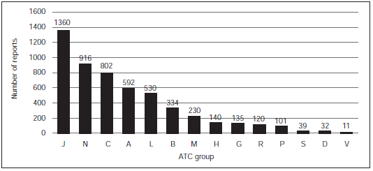 ATC groups with the highest report numberswere: Anti-infectives for systemic use (J) (n=1360,25.5%), nervous system agents (N) (n=916,17.1%), cardiovascular drugs (C) (n=802, 15.0%),alimentary tract and metabolism drugs (A) (n=592,11.1%), and antineoplastic and immunomodulatingagents (L) (n=530, 9.9%) (figure 1). Table 2 showsthe top 15 ATC subgroups (code letter and firsttwo digits).