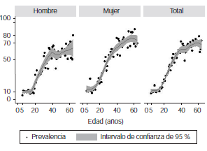 La edad de los hombres estudiados fue de 37,7 años + 0,01 (promedio + error estándar) y, la de las mujeres, de 38,5 + 0,01, con una diferencia por el sexo de p≤0,0001. La prevalencia de sobrepeso fue de 36,9 % y, la de obesidad, de 15,9 %. La prevalencia de exceso de peso en los hombres entre los 18 y los 24 años fue de 24,7 %, y en las mujeres, de 27,0 % (razón de prevalencia, RP= 1,13; IC95% 0,80-1,54; p=0,503). En los hombres y las mujeres entre los 60 y los 64 años, fue de 62,6 y 71,7 %, respectivamente (RP=1,51; IC95% 0,84- 2,73; p<0,0001).
