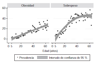 Conclusiones. El exceso de peso aumentó de manera constante con la edad y más en las mujeres,y se asoció con los indicadores de estatus socioeconómico y con el cambio del patrón tradicionalalmidónal de proteína-fibra