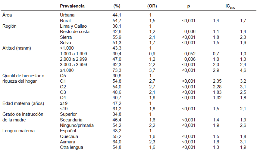 Todas las variables sociodemográficas evaluadas resultaron asociadas a anemia en los niños de seis a 35 meses de edad según el análisis univariado (cuadro 1). Los factores estadísticamente asociados a anemia en los niños fueron los siguientes: residir en un área rural (p<0,001), vivir fuera de Lima y Callao, residir a una altitud mayor de 2.000 m (p<0,001), pertenecer a hogares clasificados en los primeros quintiles de bienestar o riqueza (más pobres) (p<0,001), y tener una madre joven (p<0,001) sin nivel de instrucción superior (p<0,001) y cuya lengua materna fuera diferente al español (p<0,001).