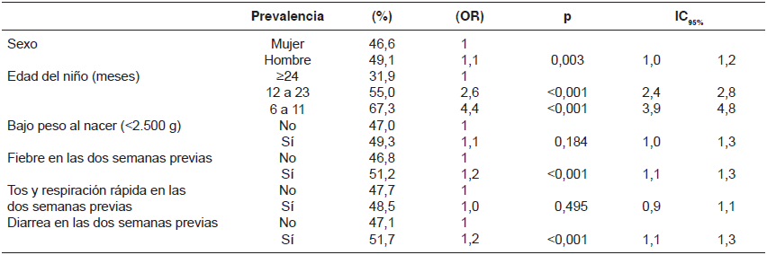 En el grupo de variables relacionadas con el niño, dichos factores incluyeron ser varón (p=0,003), menor de 24 meses y haber tenido fiebre (p<0,001) o diarrea (p<0,001) en las dos semanas previas (cuadro 2).