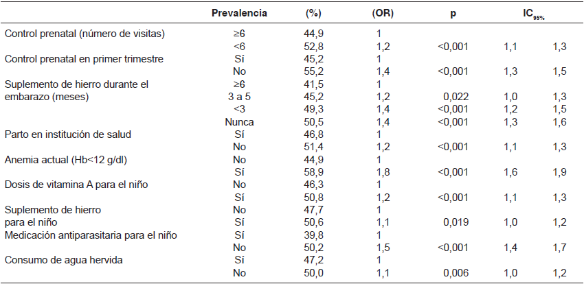 Las variables de cuidado materno asociadas a anemia en el niño fueron: no haber tenido, por lo menos, seis controles prenatales durante la gestación (p<0,001); no haber asistido al control prenatal durante el primer trimestre (p<0,001); no haber tomado hierro durante el embarazo (p<0,001); no haber tenido el parto en una institución de salud (p<0,001), y que a la madre se le hubiera diagnosticado anemia en el momento de la encuesta (p<0,001) (cuadro 3).