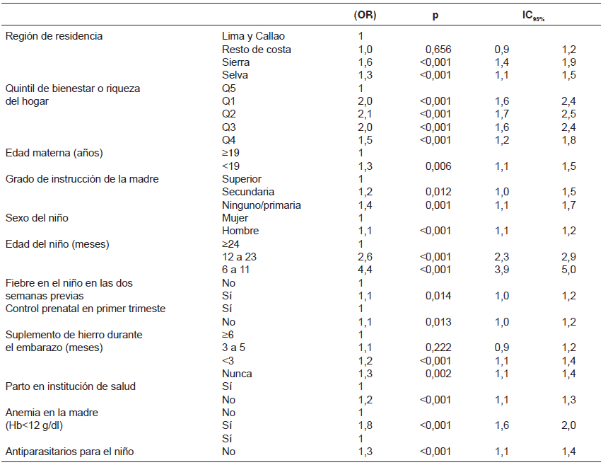 Resultados. La prevalencia de anemia fue alta (47,9 %). Se identificaron doce factores asociados con la anemia: factores sociodemográficos como vivir fuera de Lima y Callao; en un hogar con bajo nivel socioeconómico; tener una madre adolescente y con bajo nivel educativo; ser de sexo masculino con edad menor de 24 meses y antecedentes de fiebre reciente, y factores relacionados con el cuidado materno-infantil como la falta de control prenatal en el primer trimestre, la falta de suplemento de hierro durante el embarazo o administrado durante un periodo breve, parto en el domicilio, diagnóstico de anemia en la madre en el momento de la encuesta y ausencia de tratamiento antiparasitario preventivo en el niño.