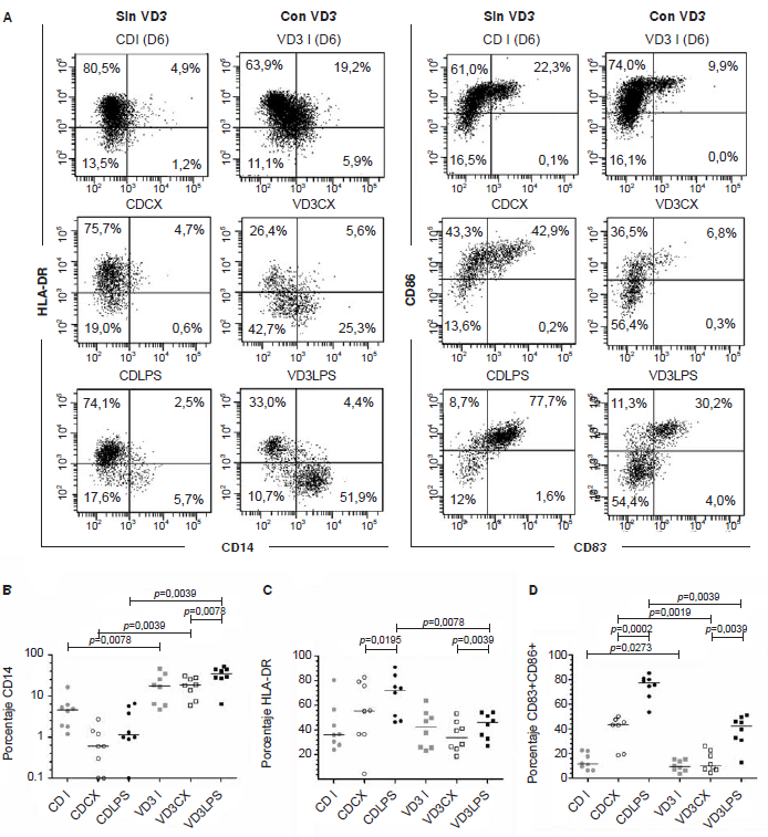 Tanto en las células dendríticas inmaduras (VD3 I-CD I) como en las estimuladas con lipopolisacáridos (CDLPS-VD3LPS) y sus respectivos controles (CDCX-VD3CX), se evaluó la expresión de CD14, HLA-DR, CD83 y CD86 por citometría de flujo (figura 1A).