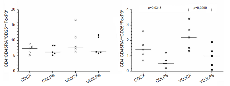 Las células dendríticas generadas con la vitamina D3 y maduradas con lipopolisacáridos disminuyen su capacidad de inducir LTreg activados (CD4+CD45RAlowCD25hiFOXP3+) a partir de linfocitos T CD4+ vírgenes alogénicos.
