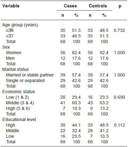 In factors associated with a multinomial variable, we used the conditional logistic regression for paired cases and controls with a 1:1 ratio through contrasts for indicator variables, taking one of the k categories as a base and creating k-l indicator variables. Factors with a quantitative variable were also evaluated using conditional logistic regression. The interaction or modification of the factors´ effects was evaluated in the conditional logistic regression model. Previously, we evaluated the assumption of multi-colinearity between the independent variables.