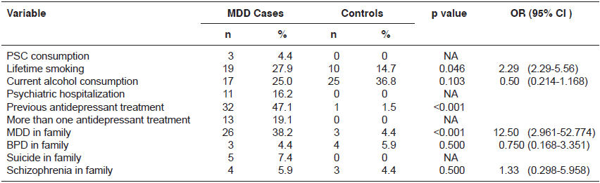 The study group included 136 individuals: 68 cases and 68 controls. According to the results of the structured DSM-IV-TR MINI interview, the cases fulfilled the criteria for major depressive disorder; 70.6% of these patients had melancholic symptoms, and 64.2% had some degree of suicide risk; the suicide risk was classified as slight (32.8%), severe (25.4%), and moderate (6.0%); 47.1% (n=32) of participants had received prior antidepressant therapy, and 19.1% of them (n=13), more than one treatment. The most prescribed medications were fluoxetine (40%), sertraline (24%) and amitriptyline (9%).