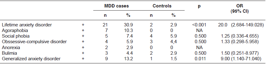 The factors associated with major depressive disorder were comorbidity with anxiety disorders (anxiety disorder at least once in their lifetime, and generalized anxiety disorder), suicide risk, and family history of depression. A familial tendency towards suicide was also found among cases.