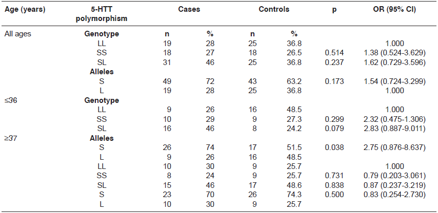 Table 4 shows the distribution of the genotype and allele frequencies of the 5-HTT gene in the study sample. The study population was in Hardy-Weinberg equilibrium (p>0.05). The SL genotype and S allele group frequency was greater in cases than in controls, although with no significant difference; the frequency of the S allele was significantly greater in the group of cases under the age of 37.