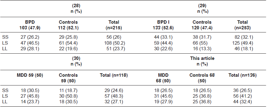 Only one of the Colombian studies involved major depressive disorder cases (30). These three studies found no statistically significant association between 5-HTT polymorphism and the evaluated mood disorder. However, this last study on major depressive disorder showed that the absence of the S allele conferred a protective tendency against the major depressive disorder, although it did not achieve statistical significance.