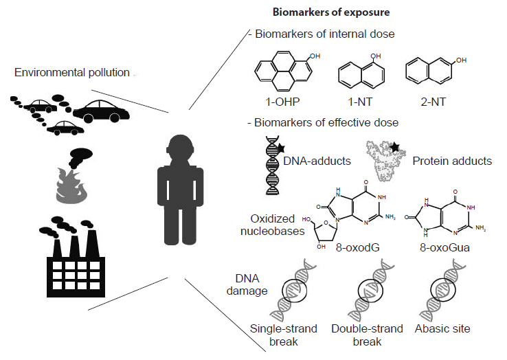 Biomarkers of effective dose indicate the interaction of a chemical with a biological target, such as DNA and proteins, or its damaging effect to a biological molecule. Considering that there may be substantial inter-individual variations in the metabolism of the compounds, the determination of the effective dose is required for the evaluation of the health effects of pollutants in organisms (4). The classical biomarkers of effect determined by the exposure to chemical pollutants are DNA and protein adducts; the levels of DNA oxidized nucleobases and DNA damage.