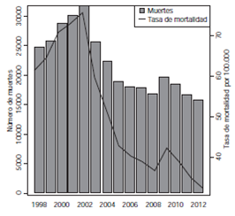 En Colombia, ocurrieron 331.470 homicidios entre 1998 y 2012, con un promedio de 22.098 homicidios por año. En relación con las muertes por todas las causas, los homicidios correspondieron al 11,5 % en promedio. La tasa cruda promedio para el periodo fue de 51,5 por 100.000 habitantes: 95,9 en hombres y 8,2 en mujeres. En el 2002 se registró el mayor número de muertes por esta causa, con un total de 31.807 defunciones, para una tasa de 77,0 muertes por 100.000 habitantes. Entre el 2003 y el 2008 se observó una disminución en el número de muertes. Sin embargo, en el 2009 se notó un aumento de 16,3 % (2.755 muertes más) con respecto al año anterior. A partir de 2010 volvió a registrarse un descenso (figura 1). Los más altos cambios porcentuales en las tasas de mortalidad se registraron entre 2002 y 2003, cuando estas disminuyeron en 20,5 %, y entre 2008 y 2009, cuando aumentaron en 15,0 %.
