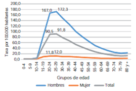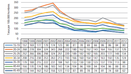 En la figura 2 se presentan las tasas de mortalidad específicas para homicidios por sexo para el periodo de 1998 a 2012. Las tasas más altas se observaron en el grupo de hombres de 20 a 29 años de edad. La tasa promedio más alta se registró entre hombres de 25 a 29 años (172,3 homicidios por 100.000).