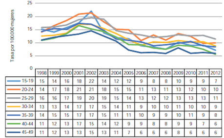 La mayor tasa de mortalidad por homicidio en hombres, entre 1998 y 2004, se registró en el grupo de 20 a 24 años (267,6 y 222,2 por 100.000, respectivamente) y, entre el 2004 y el 2012, en el grupo de 25 a 29 años (219,7 y 133,5 por 100.000, respectivamente) (figura 3). En cuanto a las mujeres, en general, las tasas más altas las compartieron los grupos de 20 a 24 y de 25 a 29 años de edad, aunque en el 2002 se notó un incremento en las tasas del grupo de 15 a 19 años, el cual igualó las del grupo de 20 a 24 años (figura 4).