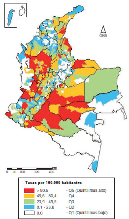 Para representar gráficamente las tasas ajustadas de la mortalidad promedio del periodo, se utilizó una representación cartográfica en coropletas, con intervalos de quintiles, en la cual el quintil más alto representaba los municipios que registraron las tasas de mortalidad por homicidios más altas. Para este procedimiento, se utilizó la proyección cartográfica cilíndrica de Mercator y el sistema Datum MAGNA-SIRGAS con origen Bogotá.