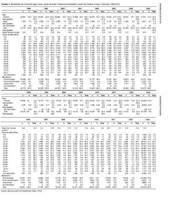 En Colombia, la tasa cruda promedio para el periodo de 1998 a 2012 fue de 51,5 por 100.000 habitantes: 95,9 en hombres y 8,2 en mujeres. La razón de hombre a mujer fue de 10 a 1, como mínimo. Una alta proporción de los homicidios se perpetró con armas de fuego. Las tasas de mortalidad fueron más altas en hombres, y en los grupos de edad de 20 a 24 y de 25 a 30 años.