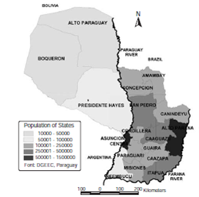 Paraguay has over 6 million inhabitants; it has 17 states besides the capital, where political and economic powers are concentrated (figure 1). The Paraguay River divides the country geographically; the eastern region is more densely populated than the western region, which borders Bolivia and Argentina. Although it has no coasts, the Paraguay and Paraná rivers provide the country with a route to the Atlantic Ocean, which serves to export a variety of products, mainly soy and beef (figure 1).