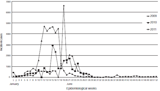 The study used official data related to suspect dengue cases for the period 2009-2011, obtained from the Ministerio de Salud Pública y Bienestar Social web site (http://www.mspbs.gov.py/). The analysis included information from weeks 1 to 29 for the year 2009, weeks 1 to 10 and 12 to 29 for 2010 and weeks 5 to 52 for 2011. The weeks that were not included corresponded to periods during which there were no reports. A suspected case was defined as a case of non-specific acute febrile syndrome notified from an area with endemic circulation of dengue virus (2,18) (figure 2).