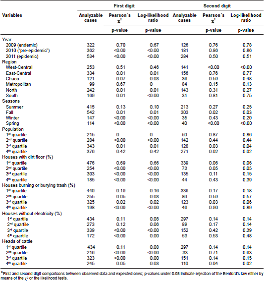 It is important to note that the behavior of the first digit did not fit Benford's law, with the following exceptions: The west-central region, summer months, the more densely populated states with fewer households with dirt floors and fewer households burning or burying garbage, households with better access to electricity and places with fewer heads of cattle. These data suggest that epidemiological surveillance performed better in the states of Central, Cordillera and Paraguarí (west-central). However, given the high number of zeros, it was necessary to take into account the second digit, with which we observed a better fit with Benford's law. The analysis with the second digit was also useful to evaluate the problem of differences in the number of cases due to significant reporting irregularities.