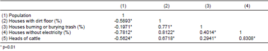 Table 1 summarizes the stratified analysis, which showed that the behavior of the first digit fitted Benford's law for 2009 in the west-central region during summer and in those states with more population, better housing conditions and fewer heads of cattle. The behavior of the second digit also fitted Benford's law, except for certain categories, such as autumn and spring seasons, the third and fourth population quartiles, the first and second quartiles of households with dirt floors, the third quartile of burning garbage and the highest quartile of heads of cattle. On the other hand, population variables were negatively correlated with variables reflecting poor housing conditions (table 2), and these latter variables were strongly correlated with each other.