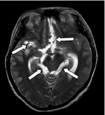 Consultó por cefalea frontal de 10 meses de evolución, asociada con fotofobia y sonofobia, fiebre y vómito intermitente, cuya intensidad y frecuencia habían empeorado progresivamente. Además, presentaba alteraciones cognitivas consistentes en pérdida de la memoria reciente y alucinaciones visuales. Durante la hospitalización, presentó convulsiones parciales simples en el hemicuerpo izquierdo que luego se generalizaron.