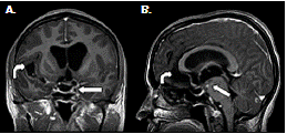 Ante la sospecha de vómito de origen central, se practicó una resonancia magnética cerebral que evidenció múltiples dilataciones de las cisternas y obstrucción del cuarto ventrículo (figura 3) y (figura 4); el líquido cefalorraquídeo tenía aspecto claro, 13 mg/ dl de proteínas, 73 mg/dl de glucosa, no presentaba leucocitos, y se registraron 3 eritrocitos por mm3; la tinción de Gram y el cultivo para bacterias resultaron negativos. Asimismo, se hizo una exploración del cuarto ventrículo por craneotomía suboccipital, mediante la cual se detectó aracnoiditis con obstrucción del agujero de Magendie, e inflamación aguda y crónica confirmada por biopsia. Se diagnosticó, entonces, vómito incoercible de origen central, secundario a neurocisticercosis racemosa (sic) y obstrucción del cuarto ventrículo, probablemente por aracnoiditis grave.