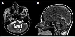 En el momento del ingreso hospitalario, presentaba signos vitales sin alteraciones, un peso de 40 kg y emaciación generalizada. La derivación ventrículoperitoneal funcionaba y no había signos de infección. En el examen neurológico, la paciente se mostró alerta, orientada en las tres esferas, con bradipsiquia, lenguaje sin alteraciones y sin signos meníngeos. El examen de fondo del ojo fue normal y los movimientos oculares no tenían limitación. Presentaba simetría facial, el reflejo nauseoso estaba conservado en forma bilateral y la movilidad de la lengua era normal. La fuerza muscular general era de 5/5, reflejos miotendinosos ++ simétricos y ausencia de reflejos anormales. Las pruebas de coordinación fueron normales y la paciente caminaba arrastrando los pies, con pasos cortos, de forma semejante a la marcha magnética.