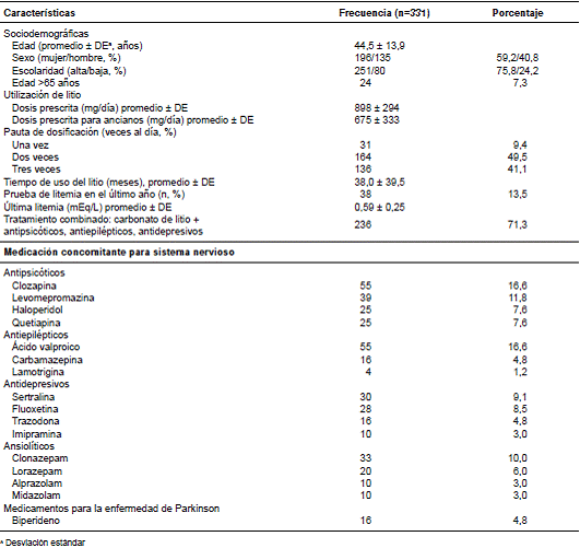 En el cuadro 1 se presentan las características sociodemográficas, los patrones de uso del litio y los otros medicamentos prescritos a estos pacientes. Se halló un predominio de personas de sexo femenino (n=196; 59,2 %), y la edad promedio fue de 44,5 ± 13,9 años. Se encontraron diferencias estadísticamente significativas entre la dosis promedio utilizada por los mayores de 65 años (675 ± 333 mg) y la de los menores de esta edad (915 ±2 85 mg) (p<0,001). Además, se encontró que 73 pacientes adultos (22,0 %) estaban recibiendo dosis diarias menores de las recomendadas, de 900 mg, y solo en un porcentaje muy bajo de sujetos se habían medido los niveles séricos de litio en sangre durante el año de estudio.