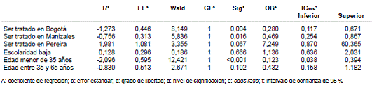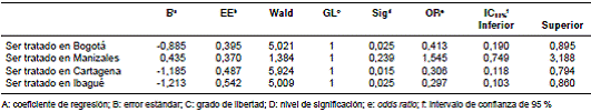 Mediante regresión logística, se encontró que no hubo diferencias en cuanto al sexo y la edad, pero se halló que ser tratado en Bogotá, Cartagena o Ibagué se asociaba de manera estadísticamente significativa con un menor riesgo de recibir tratamientos con múltiples medicamentos. Ninguna variable se asoció con un incremento del riesgo (cuadro 2).