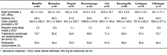 Materials and methods: We conducted an observational retrospective cohort study between January 1 and December 31, 2013, which included patients with a diagnosis of bipolar disorder treated with lithium carbonate in 25 Colombian cities; we evaluated socio-demographic variables, lithium dose, co-medication, drug interactions and adverse reactions. A multivariate analysis was done using SPSS 22.0.