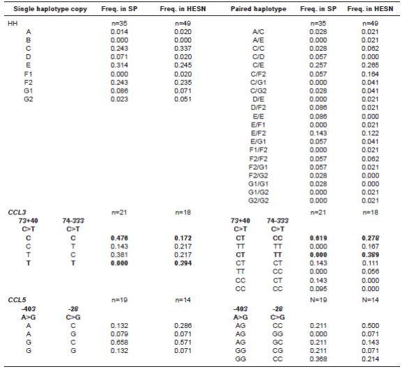 For the two polymorphic sites of CCL3, only 18 and 21 samples successfully amplified both SNPs in HESNs and SPs, respectively. For these, the four possible haplotypes (2 loci x 2 variants in each) and seven out of ten expected haplotype pairs (C(4,2)) were observed in total, with four and five pairs in the SP and HESN groups, respectively. For the two polymorphic sites in CCL5, only 14 and 19 samples successfully amplified both SNPs in HESNs and SPs, respectively. For these, the four possible haplotypes and five out of ten expected haplotype pairs were observed in total, with four and five pairs found in the SP and HESN groups, respectively (table1).