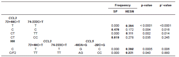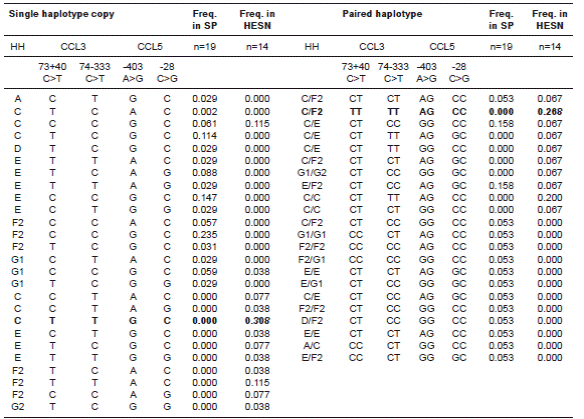 Resultados. : La homocigosis del haplogrupo humano (HH) E estaba ausente en los controles y era frecuente en los casos, es decir, con tendencia hacia la propensión. Los haplotipos C-C y T-T en CCL3 se asociaron con la propensión (p’=0,016) y la resistencia (p’<0,0001), respectivamente. Por último, en el análisis multilocus, el haplotipo combinado formado por HHC en CCR5-CCR2, T-T en CCL3 y G-C en CCL5 se asoció con la resistencia (p’=0,006).