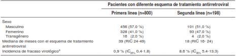 De los 998 pacientes cuyas muestras se recolectaron, 55,8 % correspondió al sexo masculino, 42,2 % al femenino y 2,0 % a personas transgénero. La mediana de meses de estar recibiendo el tratamiento fue de 39 (rango intercuartílico: 24-49) y 18 (rango intercuartílico: 16-24) para los pacientes con esquema de primera y segunda línea de tratamiento antirretroviral, respectivamente (cuadro 1). La incidencia de fracaso del tratamiento antirretroviral fue significativamente menor (p<0,01) en los pacientes con prescripción de tratamiento antirretroviral de primera línea que en quienes recibían el esquema de segunda línea (0,9 %; IC95% 0,4-1,8 y 8,6 %; IC95% 5,4-13,3, respectivamente).