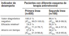 Resultados. : El valor diagnóstico negativo fue similar para los pacientes con esquema de primera línea (100,0 %; IC95% 99,5-100,0) o de segunda línea de tratamiento (99,4 %; IC95% 96,9-99,9). La incidencia del fracaso del tratamiento antirretroviral fue menor en los pacientes con tratamiento de primera línea (p<0,01), lo cual permitió un mayor ahorro en las pruebas de laboratorio en este grupo (74,0 %; IC95% 71,0-76,7) que en los pacientes con tratamiento de segunda línea (50,9 %; IC95% 44,4-57,3) (p<0,01).