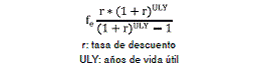 Los costos se clasificaron en las siguientes categorías adaptadas de la metodología utilizada por Alvis, et al. 27: 1) gastos administrativos, incluidos los costos relacionados con servicios públicos (agua, energía eléctrica, telefonía, internet) y con seguros, los cuales se asignaron según el número de metros cuadrados de cada banco de sangre con respecto al total de la construcción de la IPS que lo alojaba; 2) costos de capital, incluidos los costos de la edificación y de los equipos. Se analizaron los costos de capital asumiendo una tasa de descuento anual del 3 % y una vida útil de 20 años para edificaciones y de cinco años para equipos, mediante la siguiente fórmula: