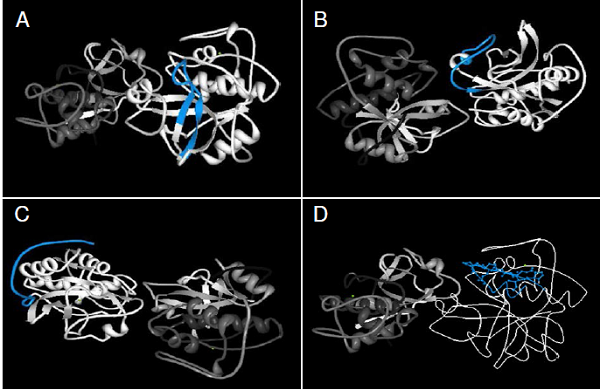 El mapeo de los oligopéptidos P01, P03, P04 y P06 en la estructura en 3D de Der p 1 evidenció que las secuencias sintetizadas se encontraban expresadas en la proteína madura de la cisteína proteasa del ácaro D. pteronyssinus (figura1). El mapeo para los oligopéptidos de Blomia tropicalis (P02 y P05) no se hizo debido a que aún no se tiene una estructura en 3D de esta proteína.