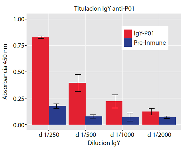 Inicialmente se estableció la concentración de anticuerpos IgY para los inmunoensayos de ELISA, para lo cual se usaron extractos crudos IgY antipéptido P01 obtenidos ocho días después de la tercera inmunización, cuya concentración de proteína total se ajustó previamente en 2,5 mg/ml. Los extractos IgY se diluyeron a 1/250 y 1/500, 1/1000 y 1/2000 en solución de anticuerpo (PBS 1X, Tween 20 al 0,05% v/v, leche descremada al 2,5% p/v). Se agregó un volumen de 100 µl/pozo de cada dilución de IgY, y se incubó en cámara húmeda durante una hora a 37 °C. Con el fin de retirar los anticuerpos no unidos, se realizaron lavados cuatro veces con PBST como se describió anteriormente. Un volumen de 100 µl de conjugado anti-Chicken IgY-peroxidasa de rábano (HRP) (Promega® G1351) diluidoa 1/1000 se agregó a cada pozo, y se incubó durante una hora a 37 °C. Se hicieron tres lavados con solución de lavado. La prueba se reveló con sustrato TMB (3,3´,5,5´ tetrametilbenzidina) (SureBlue Reserve™ Microwell Substrate, KPL Inc.), la reacción se detuvo con ácido clorhídrico 1N y se leyó en un lector de placas Synergy™HT - BioTek, a una longitud de onda de 450 nm.